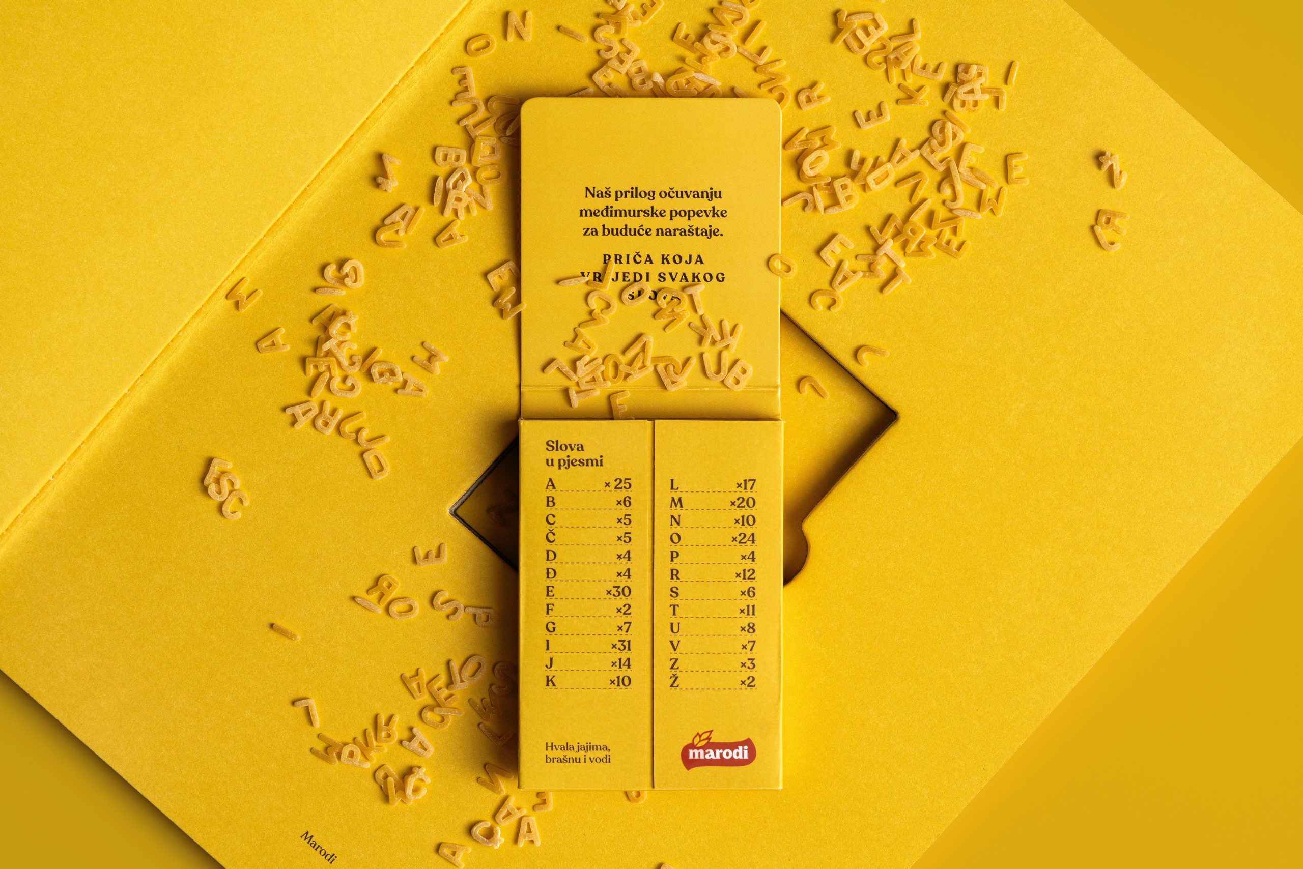 Let’s remember, in 2018 Međimurska popevka, a folksong from the Međimurje region, was inscribed on the UNESCO’s Representative List of the Intangible Cultural Heritage of Humanity, to remain safeguarded for as long as it is performed. In order to contribute to the preservation of Međimurska popevka, a limited collection of five volumes of Međimurje folksongs was designed, each volume including a special Marodi alphabet pasta packet with the exact number of letters contained in the respective folksong.
