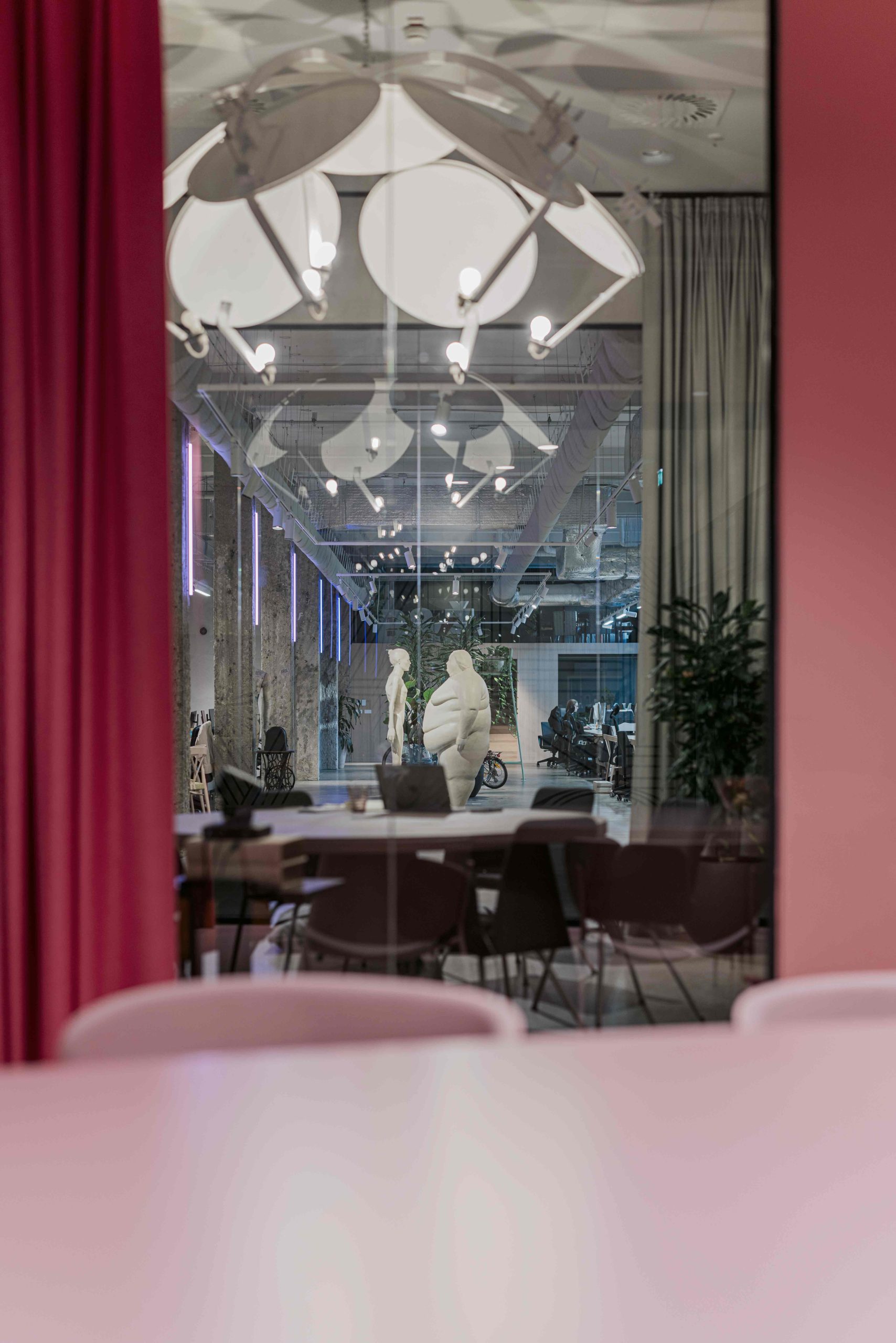 Unlike areas not directly exposed to the public, the fully monochrome zones open to the windows have more character. The aim was to achieve something unexpected for a shopping center with high-end brands. The pink room serves as the main meeting and presentation room and as an art gallery (table and chairs by Nunc), while the room clad in white ceramic tiles serves as the reception and display of agency works.
