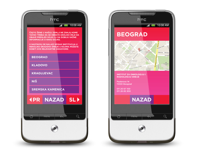 Uz podsjetnik, aplikacija sadrži jednostavno razumljivo uputstvo za samopregled u nekoliko koraka, kao i popis svih relevantnih institucija na teritoriju Srbije u kojima se mogu dobiti potrebne informacije u vezi raka dojke.
