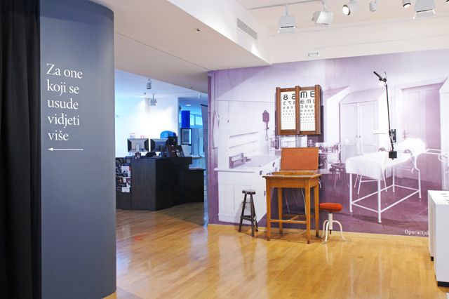 Kako bi što vjernije prenijeli osjećaj stare ordinacije, odlučeno je da se umjesto doslovnog repliciranja prostorije postojeći postamenti oblože bijelim keramičkim pločicama tipičnim za taj period. Na taj način postigli smo osjećaj stare bolnice bez pribjegavanja doslovnim interpretacijama. Na postamentima su postavljeni restaurirani originalni oftalmološki aparati. U razini očiju postavljeni su edukativni tekstovi o različitim bolestima i refrakcijama oka te dokumentarne filmske projekcije iz pedestih godina pa sve do danas kako bi se posjetitelje informiralo i potaklo na razmišljanje o svom vidu.