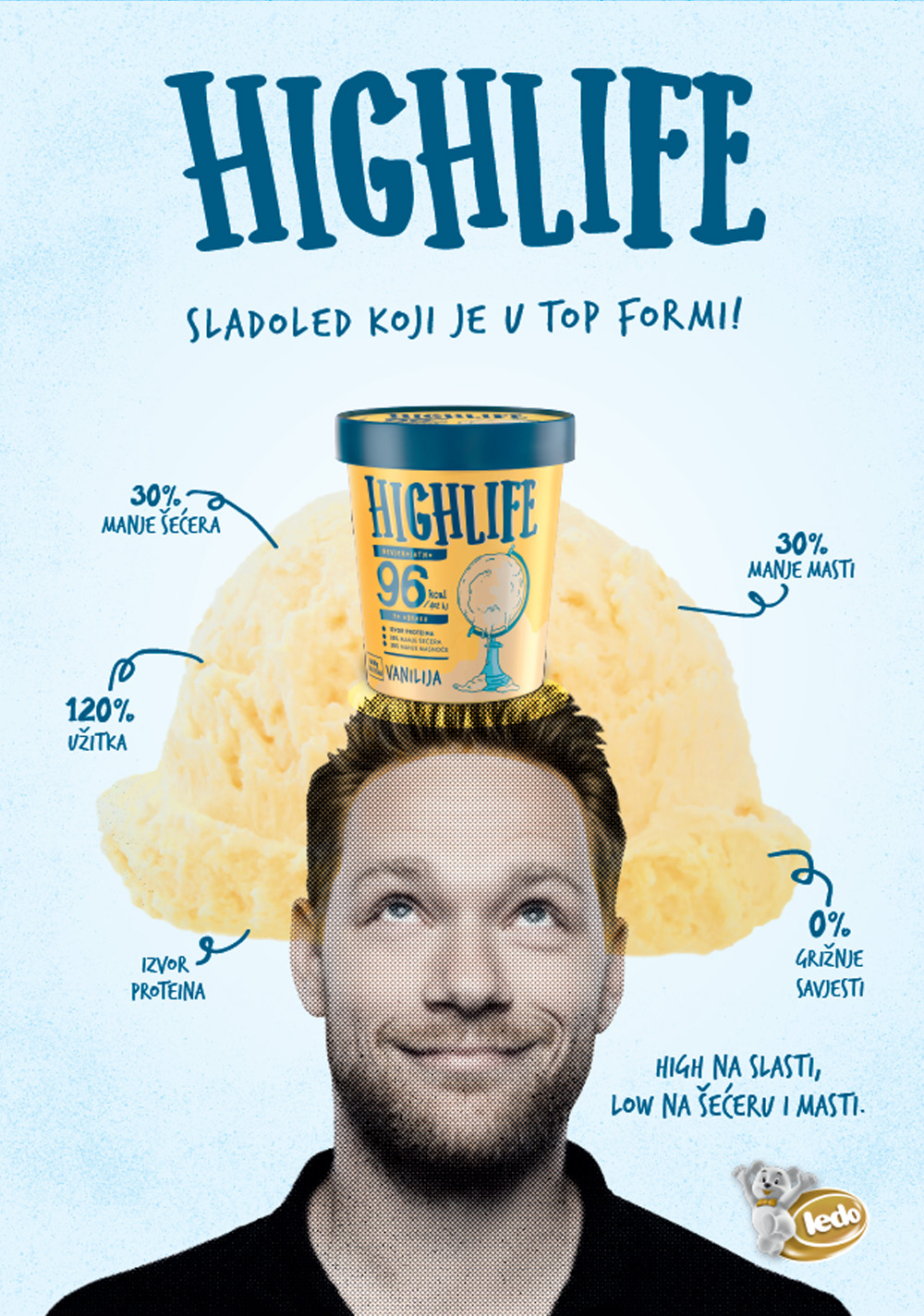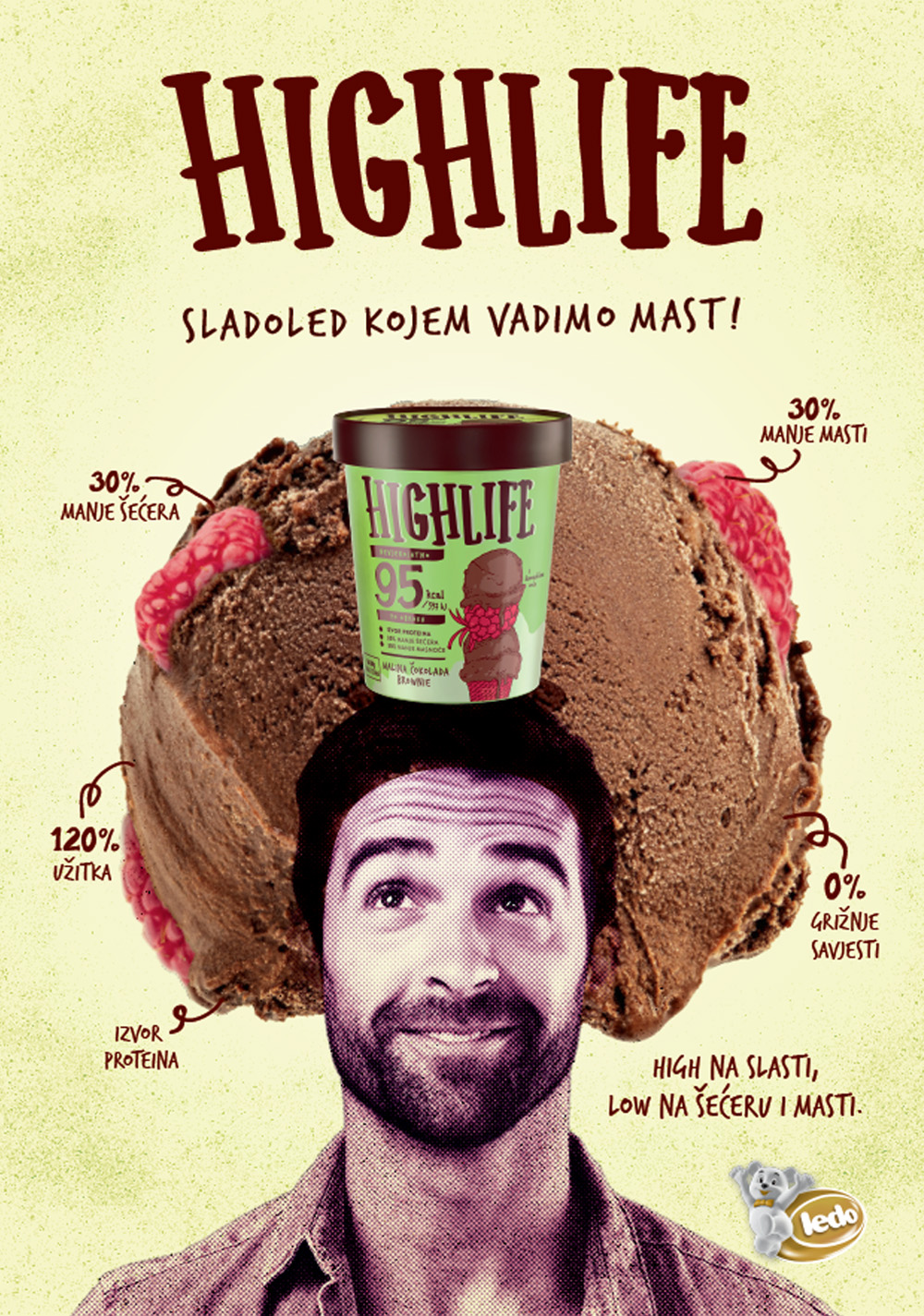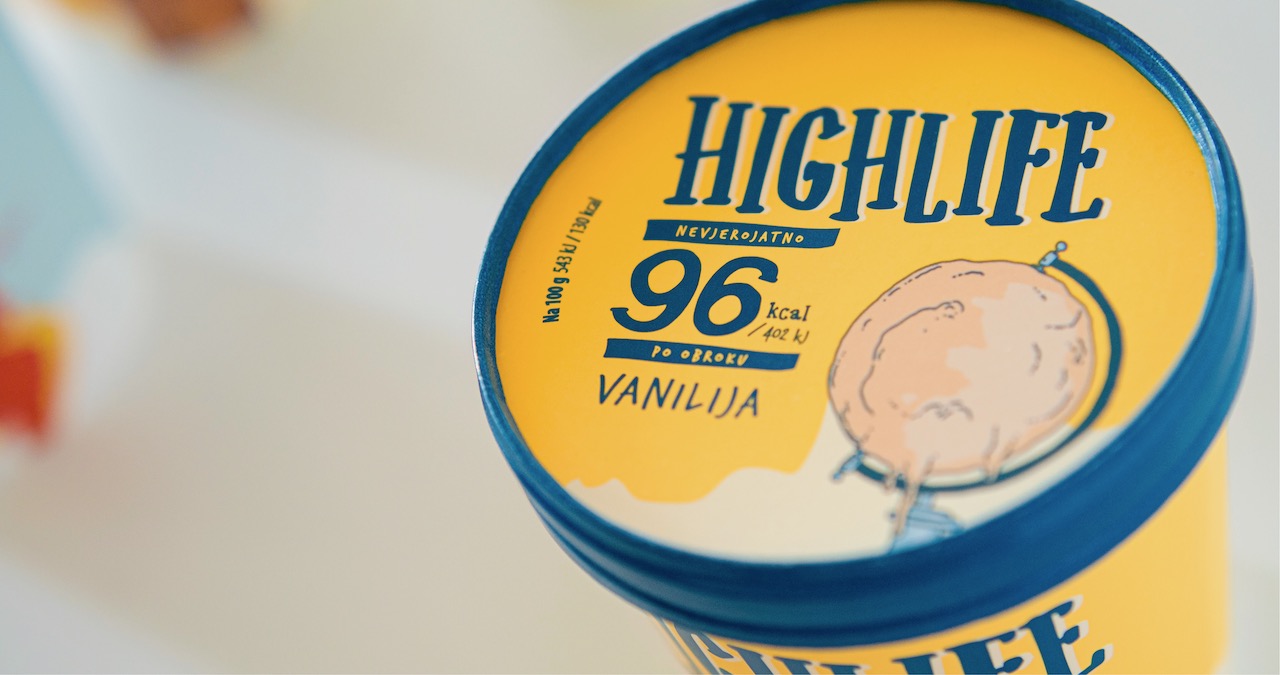 Highlife je život na visokoj nozi, a uz ovaj sladoled možemo biti high on life i dići noge high u zrak, jer možemo bezbrižno uživati u okusima života, bez grižnje savjesti. Highlife znači da možeš imati oboje – užitak i zdravlje. Highlife je high na slasti, low na šećeru i masti.