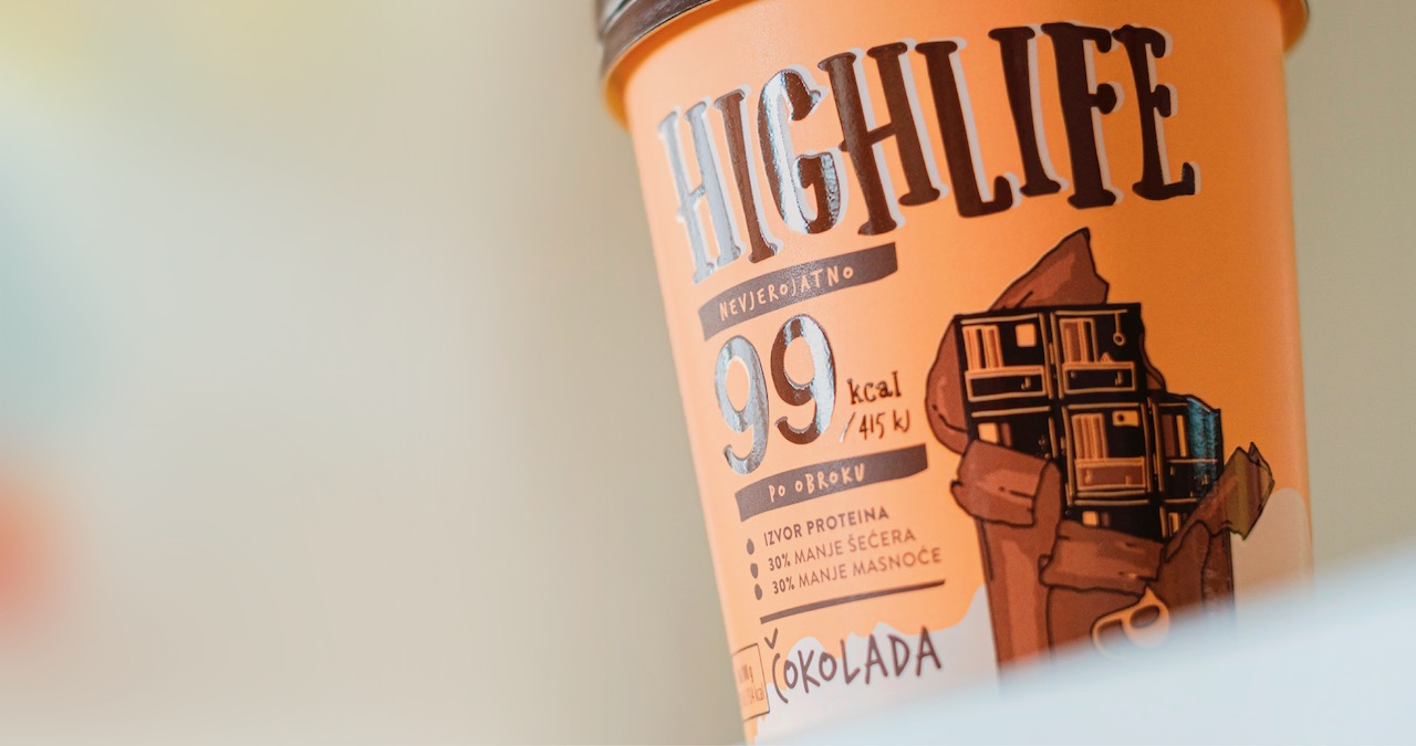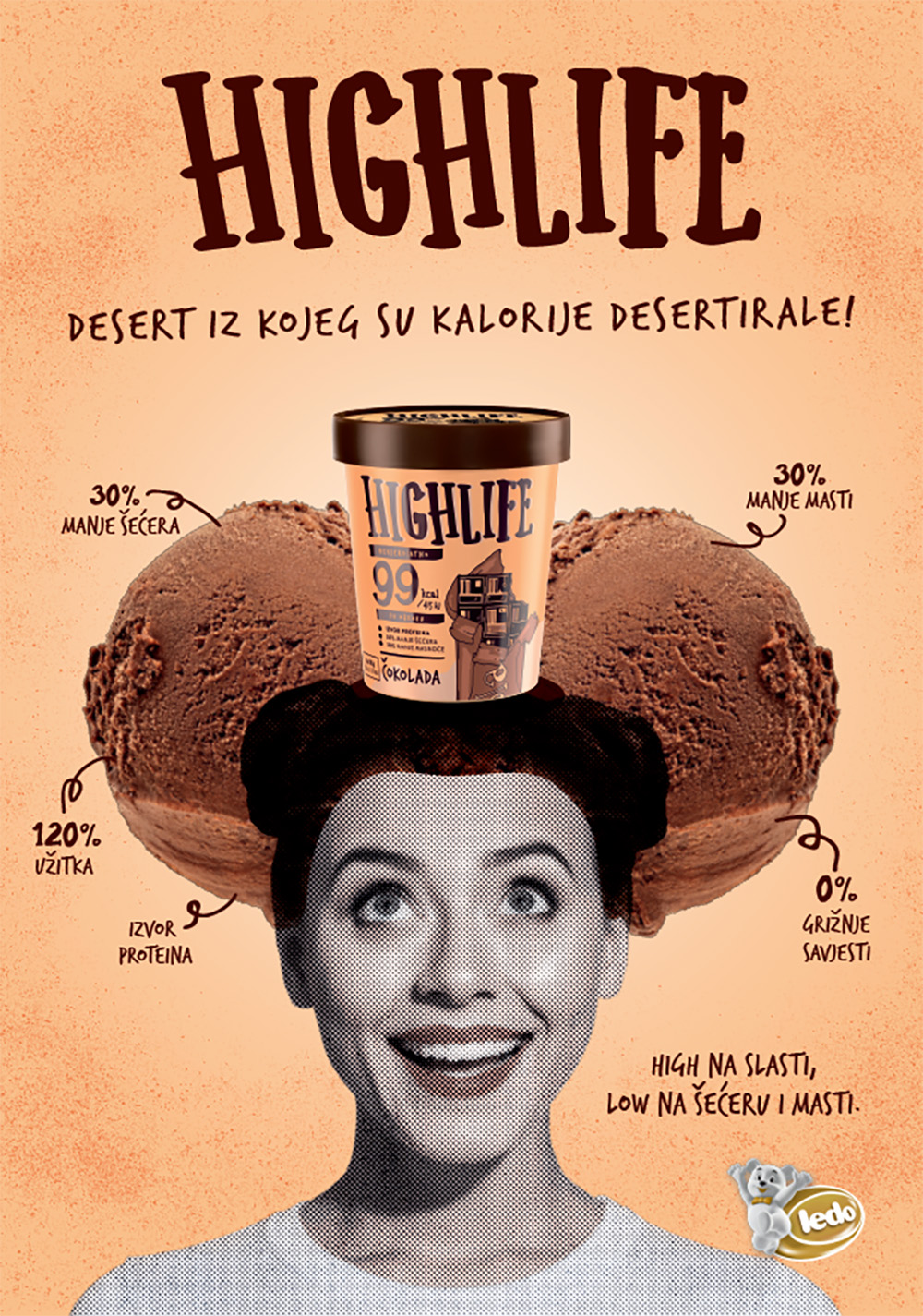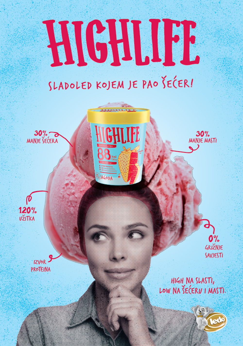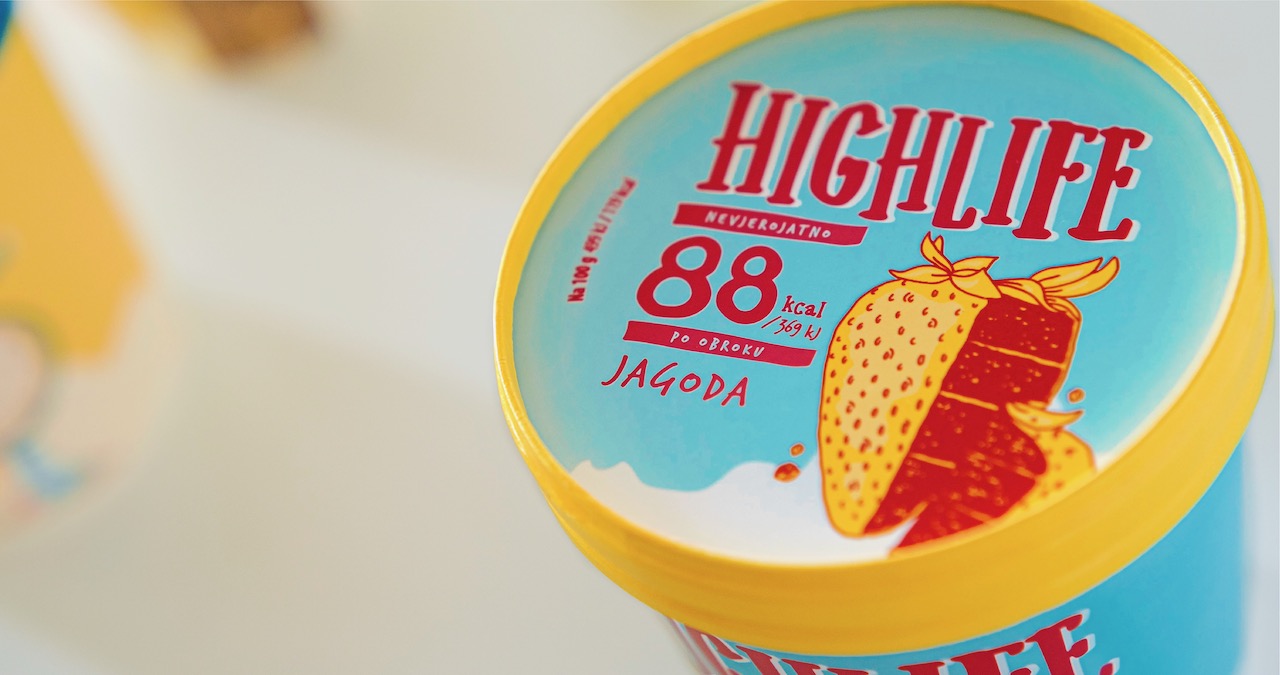 Highlife je život na visokoj nozi, a uz ovaj sladoled možemo biti high on life i dići noge high u zrak, jer možemo bezbrižno uživati u okusima života, bez grižnje savjesti. Highlife znači da možeš imati oboje – užitak i zdravlje. Highlife je high na slasti, low na šećeru i masti.