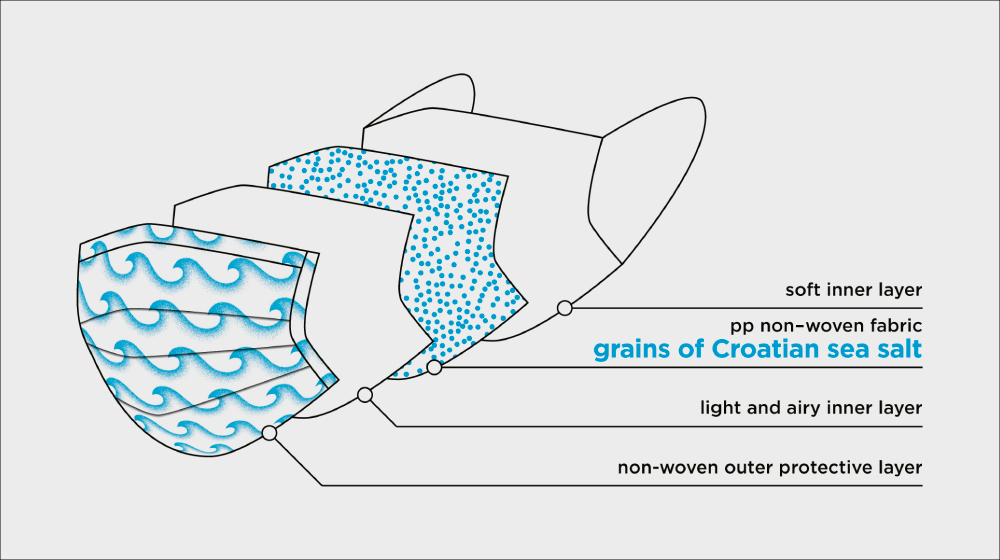 Maska za lice s dodatkom soli hrvatski je inovativan proizvod. Ova maska omogućuje blagodati udisanja morskoga zraka i onima koji ne borave uz more. Osim što pomaže u zaštiti organizma od onečišćenog zraka, ioni morske soli djeluju povoljno na sluznicu dišnoga sustava, održavajući njezinu vlažnost i zaštitni učinak.