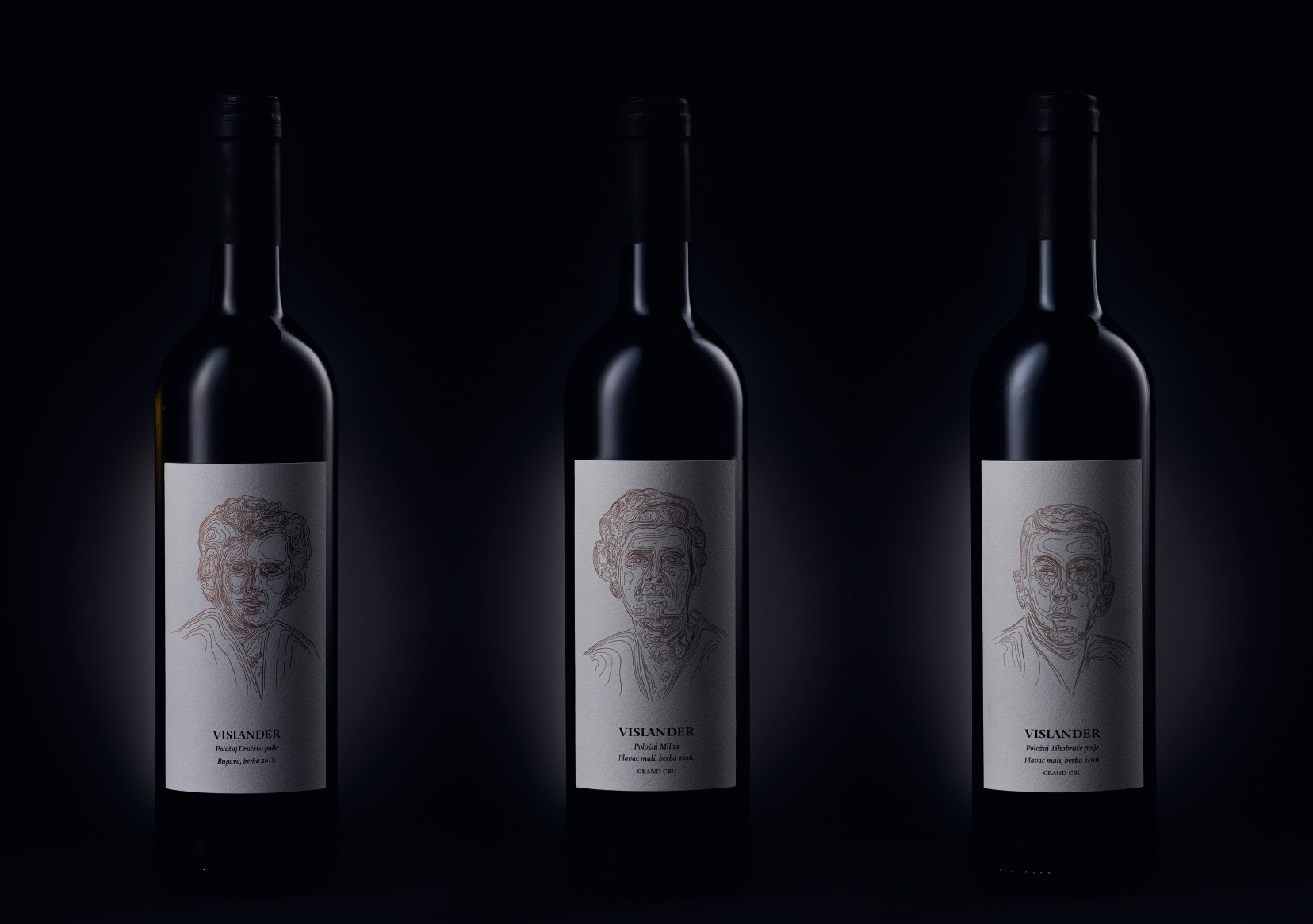 Dizajn etiketa sljubio je reljef viških polja na topografskim kartama sa starim obiteljskim fotografijama ističući odabrani smjer proizvodnje vezan uz osobitosti vinograda i njihovih položaja.