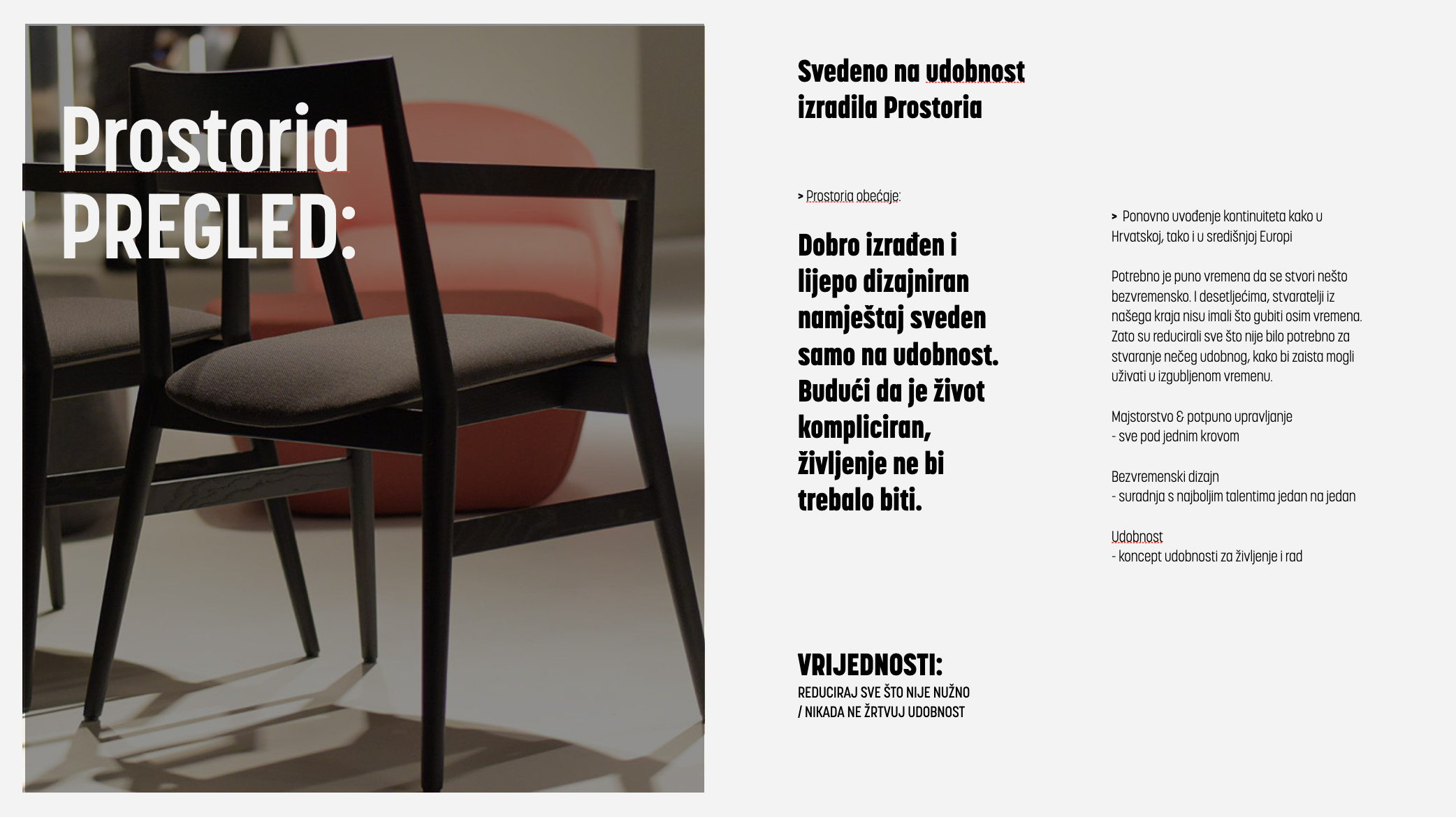 Spojem te tradicije s Prostorijinom posvećenošću detaljima i jedan na jedan suradnji s vrhunskim dizajnerima, dobivamo namještaj obilježen modernizmom i vođen principima racionalnog, neopterećen i slobodan. Upravo zbog toga što dolazi iz zemlje u kojoj je redukcija oduvijek bila nužna, ali samo do ugodnog, može ponuditi nešto posebno i novo za svijet modernog dizajna (namještaja) i zato kaže: