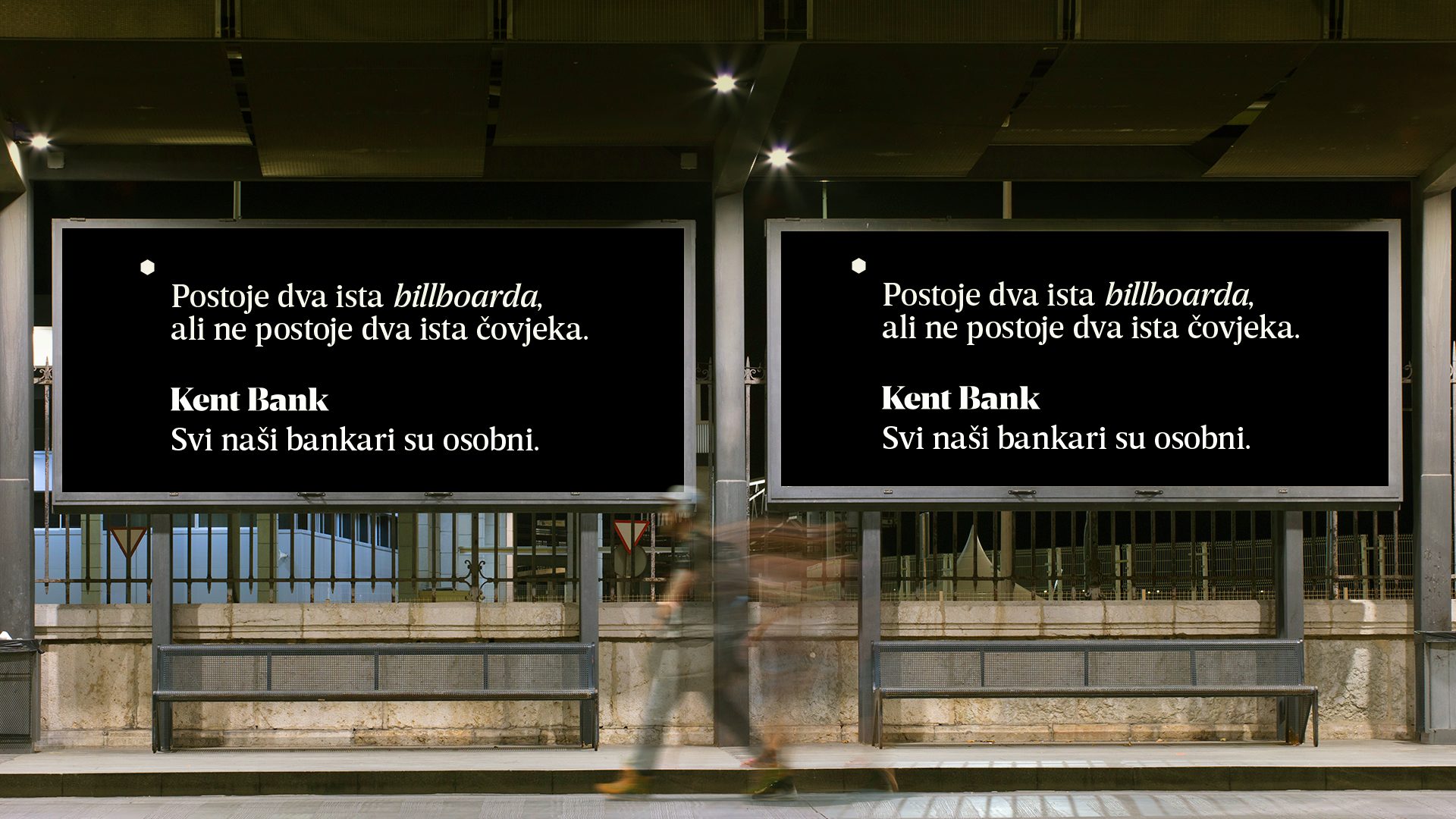 Postavljanjem po dva jednaka oglasa u istome medijskom bloku, ova kampanja dramatizira upravo činjenicu da možda postoje dva jednaka oglasa, ali ne postoje dvije jednake osobe, zbog čega su svi bankari KentBanke osobni bankari.