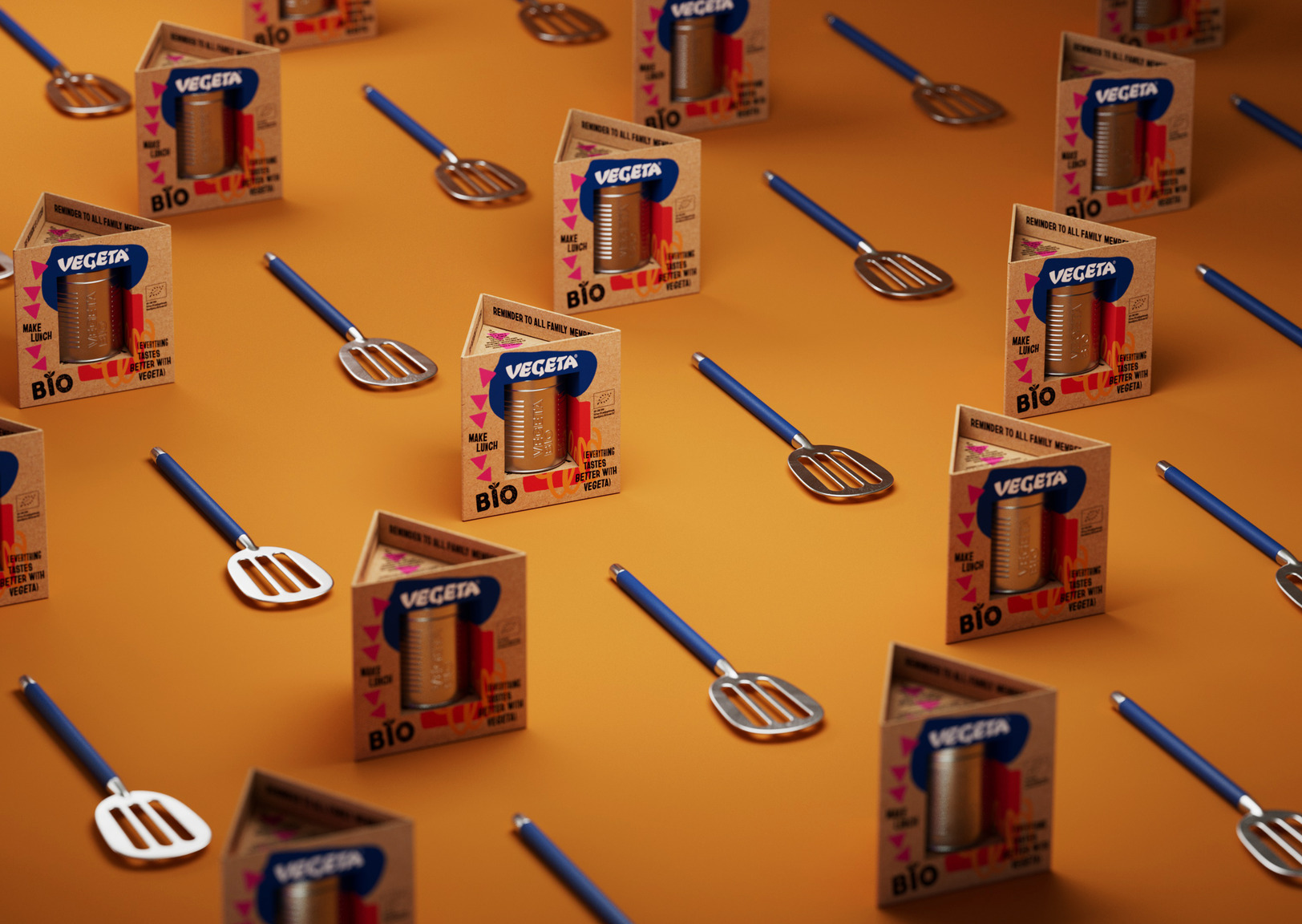 Grafički elementi na pakiranju otkrivaju bogatu povijest Vegete i njen status u popularnoj kulturi. Pakiranje je također fizička poveznica s online zbirkom jednostavnih recepata koje je stvorila zajednica ljubitelja Vegete. Pakiranje je dizajnirano kao alat za sve one muškarce koji još uvijek uče kako profesionalno koristiti lopaticu, a uključuje i detaljne upute za korištenje perilice posuđa.