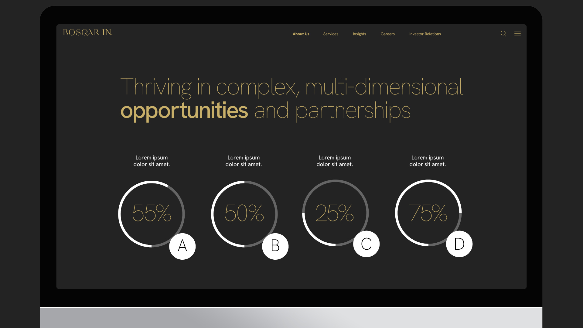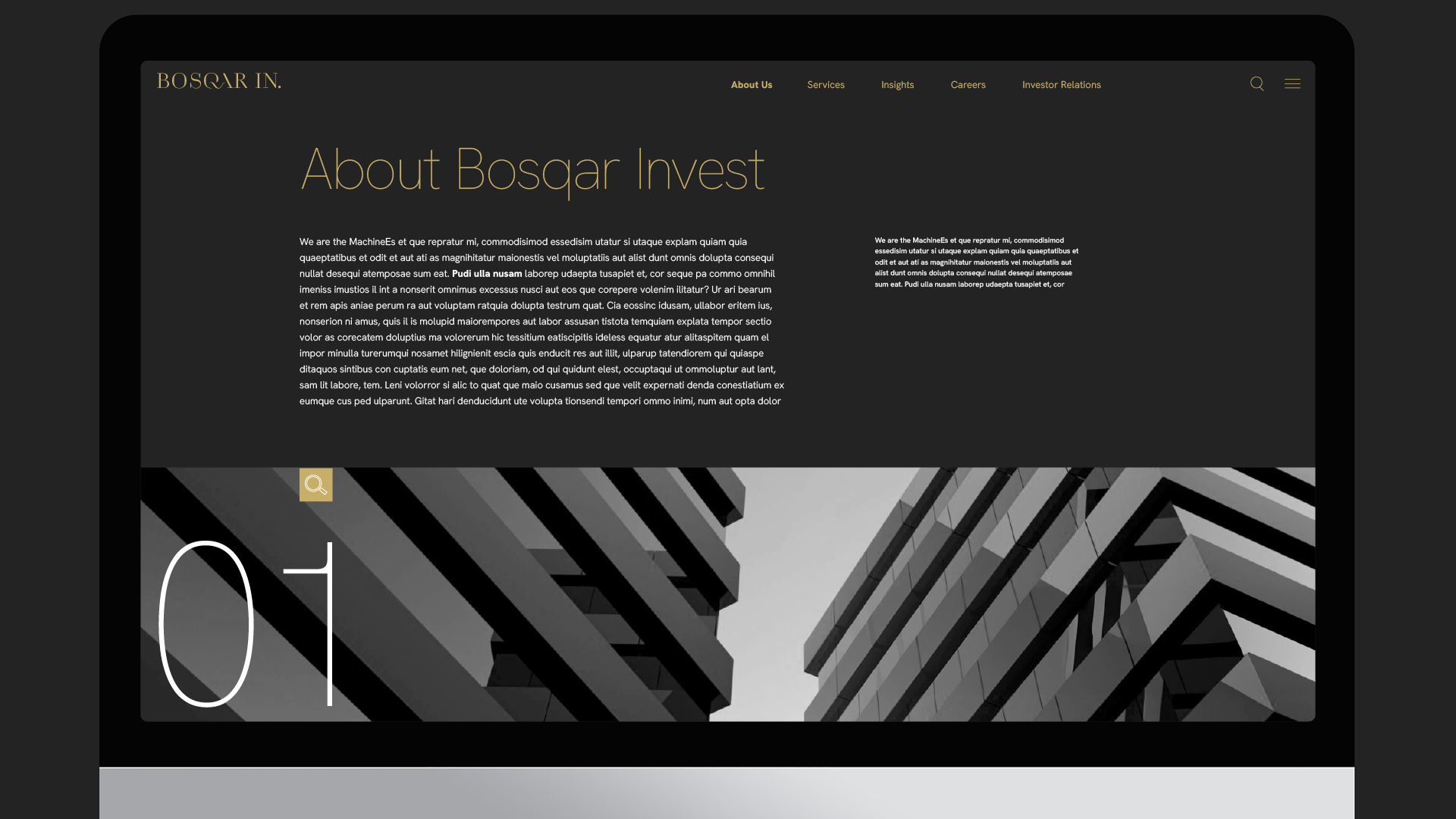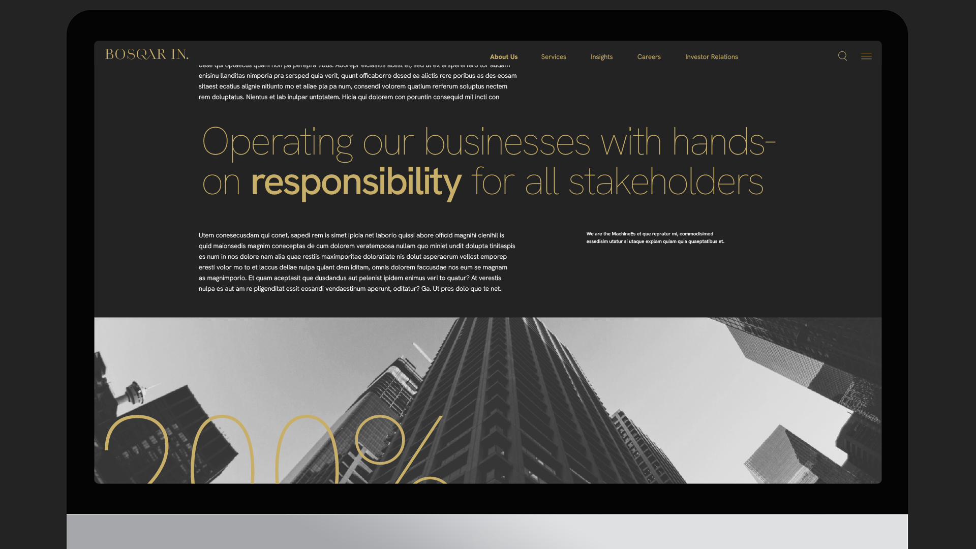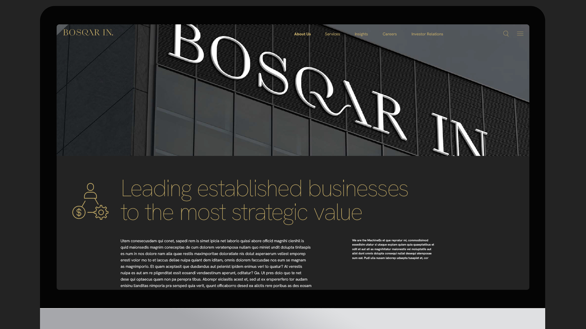 Sinteza je oživjela kroz novo ime – Bosqar In. Ime odražava snagu i stabilnost, kombinirajući asocijacije na latinsku riječ “boscus” (šuma, rast) i “boškarin” (snažan, autohtoni bik). Vizualni identitet prati istu nit vodilju, koristeći elegantnu tipografiju, zlatnu boju (bogatstvo, mudrost) i decentnu ilustraciju stiliziranih rogova boškarina. Novi brend Bosqar In. predstavlja evoluciju kompanije – odražavajući njenu snagu, stručnost i predanost stvaranju trajne vrijednosti za svoje klijente i partnere. Ova transformacija nije samo promjena imena, već je to potpuna redefinicija načina na koji se kompanija predstavlja svijetu.