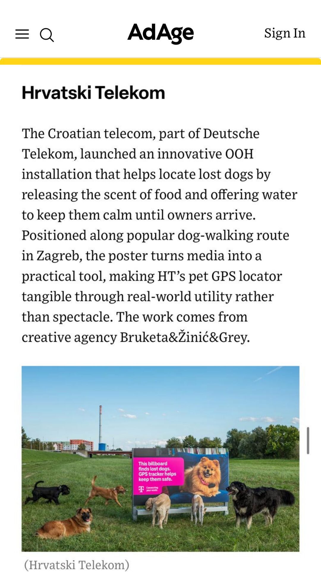 Prisjetimo se, Hrvatski Telekom je u suradnji s agencijom Bruketa&Žinić&Grey postavioinovativni plakat koji pomaže u pronalasku izgubljenih pasa. Opremljen je mehanizmom koji ispušta miris hrane, a uz njega se nalazi zdjelica s vodom kako bi privukao zalutalog psa i zadržao ga na sigurnom dok ga vlasnik ne pronađe. Plakat se nalazi na Savskom nasipu u Zagrebu, mjestu gdje svakodnevno šeta velik broj ljudi sa psima.
